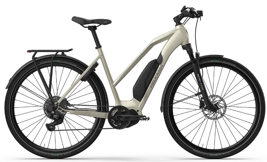 Helkama SE10L naisten sähköpyörä (2025) lukittavalla joustohaarukalla ja kattavilla vakiovarusteilla, muun muassa lukko, seisontatuki sekä etu- ja takavalo kuuluvat pyörään ilman lisäinvestointeja.